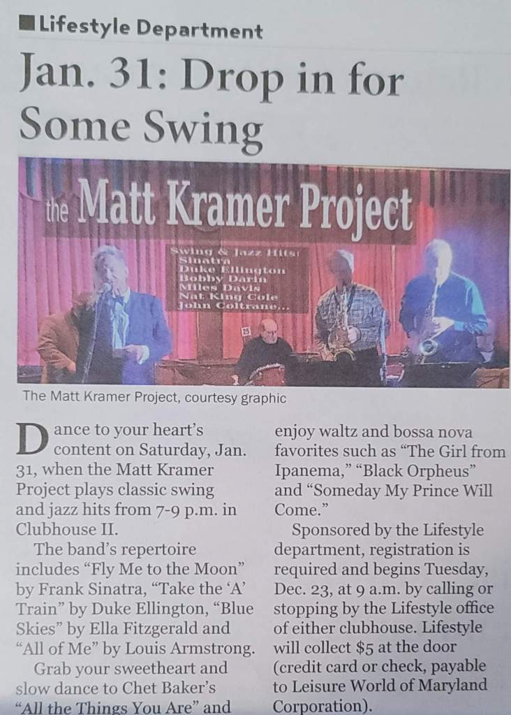 1/31/2025, 6:30 to 8:30PM, Leisure World Swing Dance, Matt Kramer Project – for the Leisure World community only.