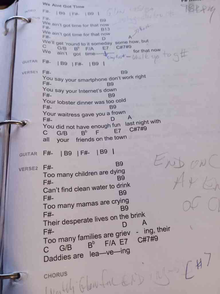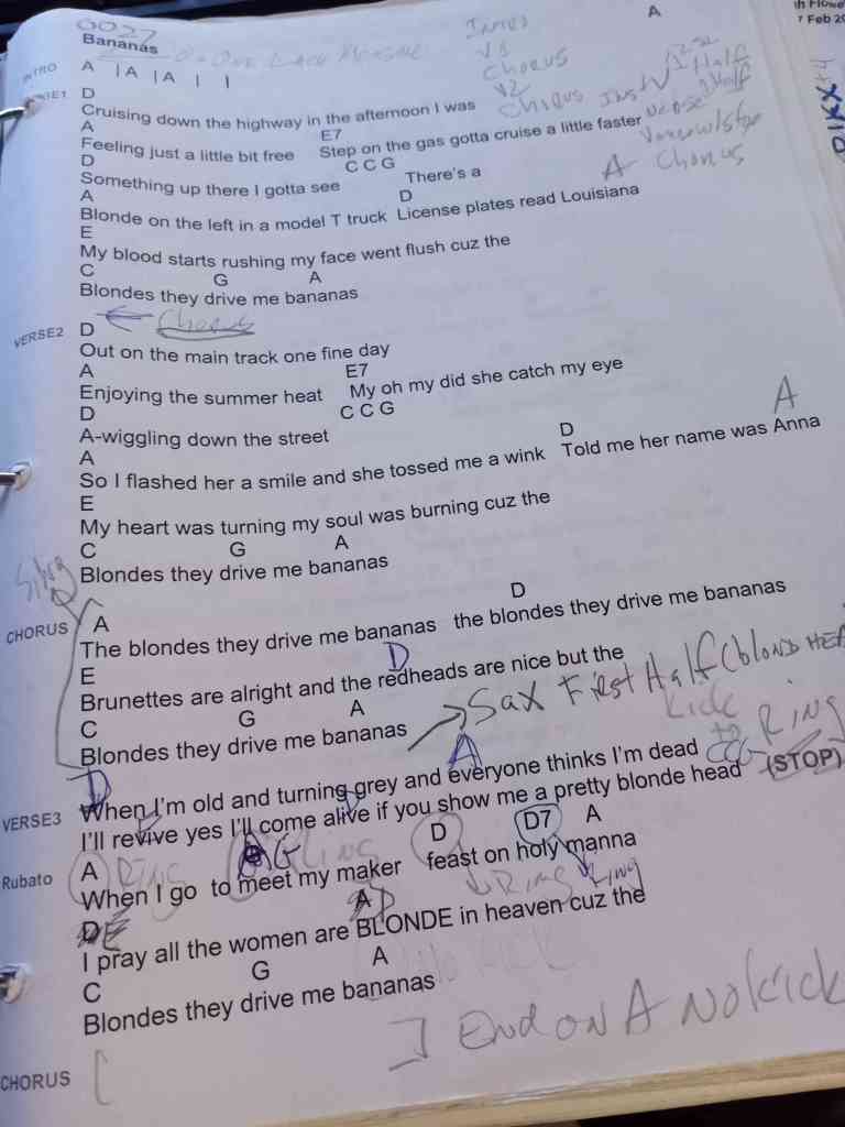 Here’s a link to the practice MP3. The song is in the key of C and the only chords are C and G. The chart below is not the most beautiful thing, but the song is simple. Glen will point to you and you can take a verse for a solo.