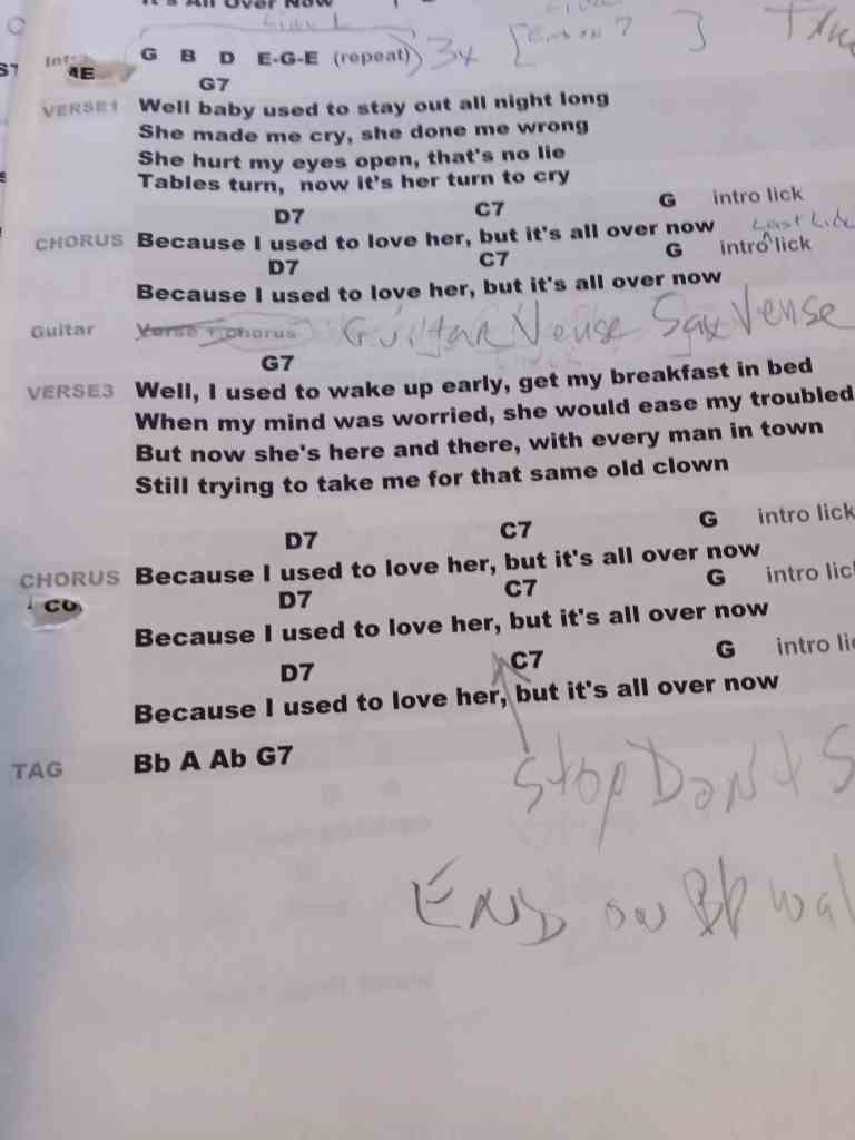 A cover of the Rolling Stones tune with a different feel. Simple, up-tempo blues number with one catchy riff. Here’s a link to the practice MP3. Glen will point to you and you can take a verse solo.