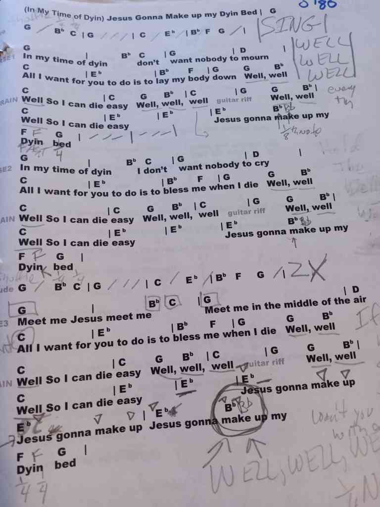 A Blind Willie Johnson blues classic. Glen will point to you and you can take a verse solo. Here’s the link to the practice MP3. And here’s my chart: